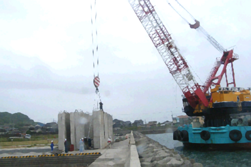 陸上で製作したカーテン版を250トン吊のクレーン船で海上を運び、ひとつ前の写真の杭に据え付けます。
